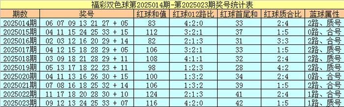 福彩双色球第2025023期红球奖号为:09、12、13、24、25、33,蓝球奖号为:07,其中红球和值为116,012路比为4:2:0,首尾和为42,质合比为1:5,蓝球属性为1路、质号。