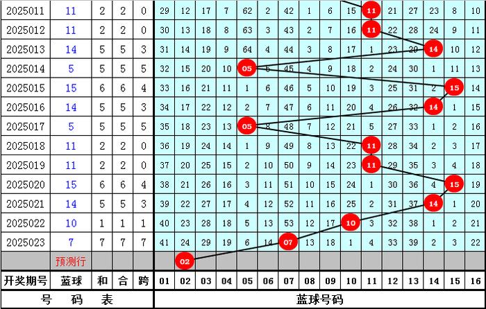 蓝球号码分析:最近30期蓝球号码质合比为13:17,最近10期蓝球质合比为5:5,最近5期蓝球离别为:11、15、14、10、07,本期看好蓝球为质数号码,参考号码02。