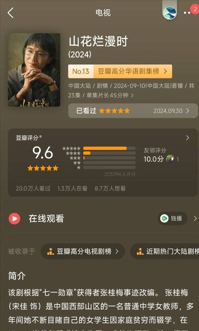 终末便是凭借《山花烂漫时》张桂梅入围的宋佳,是本届视后的热点候选东谈主。不少东谈主展望她是最可能拿奖的,旧年剧播时,就不少东谈主敕令宋佳拿奖,东谈主气很高。该剧以华坪女高确凿故事为原型,聚焦教诲扶贫主题,豆瓣评分高达9.6分,近10年评分最高分,被媒体称为“2024年国产剧天花板”。
