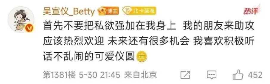 吴宣仪昨晚在超话修起:“最初不要把私欲强加在我身上,我的一又友来助攻应该利害接待,改日还有好多契机,我心爱听话不乱闹的可人仪圆。”