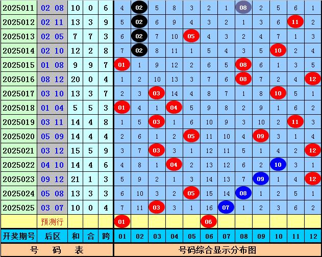 前区余数质合分析:上期前区包含2个质尾奖号:03、25,开出3个合尾奖号:06、08、10,最近10期前区奖号质合余数个数比为26:24,质合余数奖号出现比例特殊,本期适应柔和质尾奖号转热,预测开出3个质尾奖号。