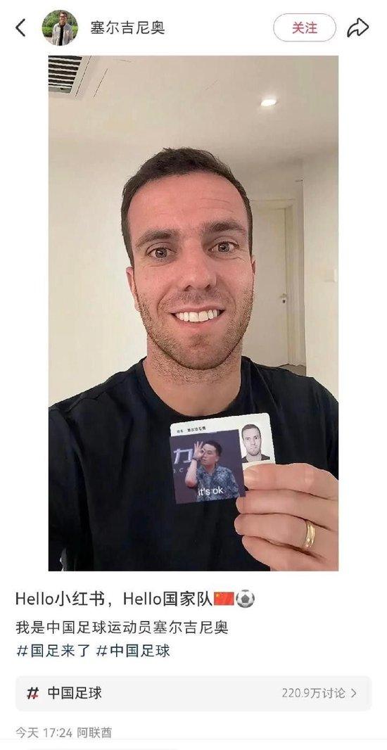 塞尔吉尼奥晒照:我是中国足球绽放员