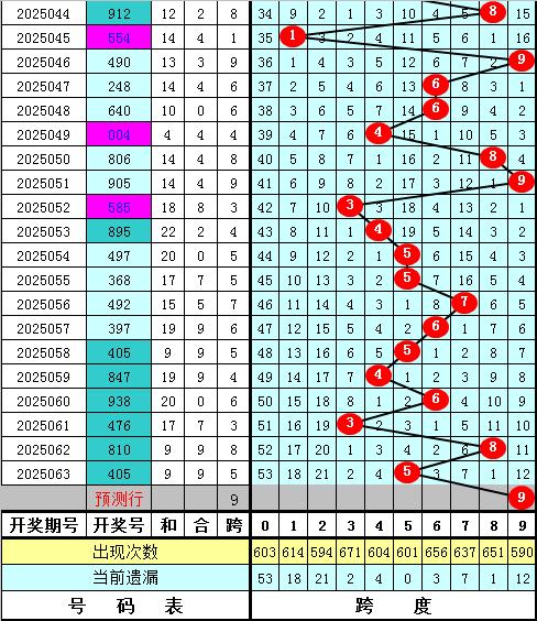 福彩3D第2025063期最大跨度开出5,近期最大跨度波动较大,本期展望最大跨度在5-9区段开出,最大跨度参考6789,一码跨度参考9。