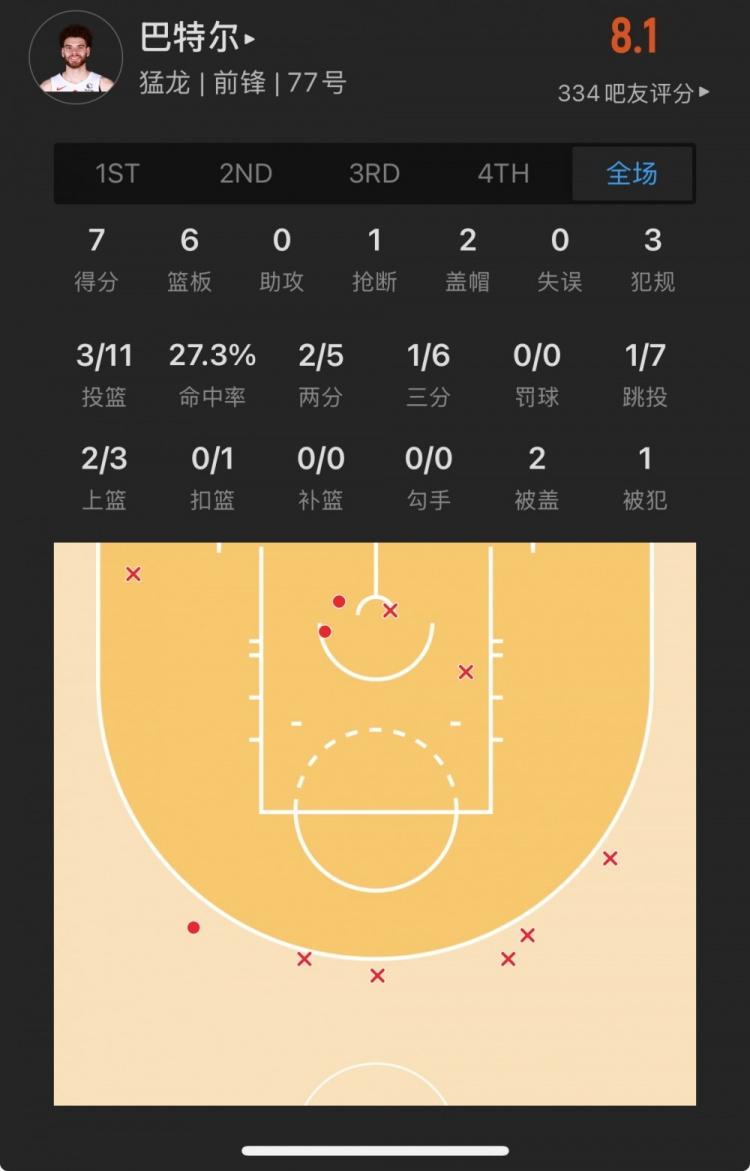 猛龙落第秀 贾米森-巴特尔 登场36.5分钟