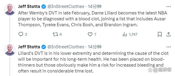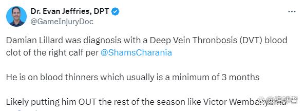 利拉德的伤病依然确诊为右小腿深静脉血栓,将无尽期休战,利拉德正在服用血液稀释药物,血栓依然踏实下来,他将链接接收依期检查。