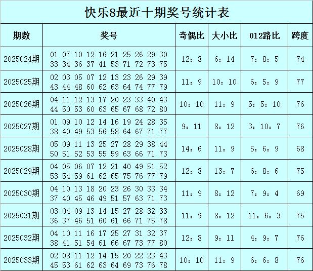 福彩满足8第2025033期开奖追思:02 08 11 12 14 15 20 22 23 43 45 53 61 62 63 64 69 73 76 78,其中奖号奇偶比开出10:10,大小比开出11:9,012路比开出6:6:8,和值为814,跨度为76。